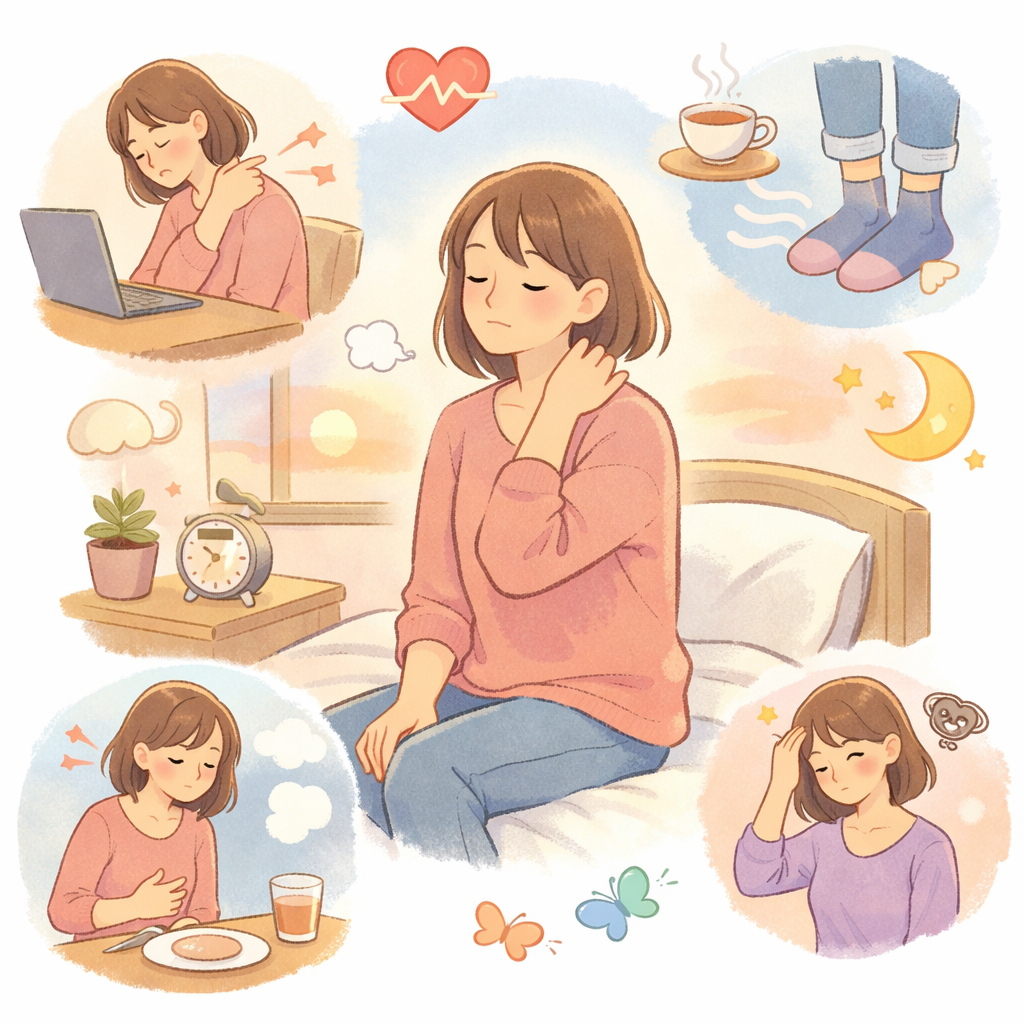 また、手足の冷えを感じやすくなったり、反対に顔や上半身がほてるように感じたりすることもあります。季節に関係なく起こるこうした感覚は、体がうまく切り替えられていないときに出やすいものです。「昔からだから」と思い込まず、最近の生活を振り返ってみるのもひとつです。