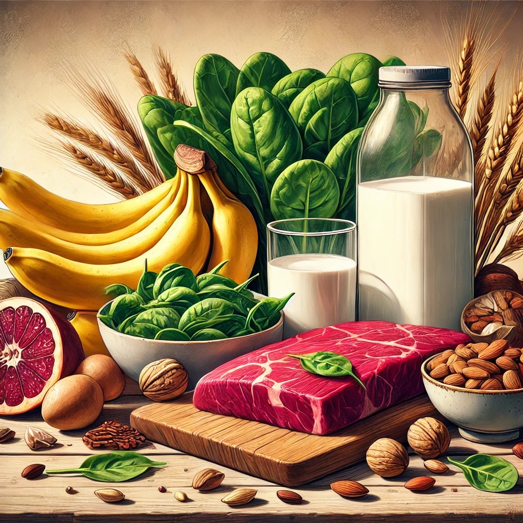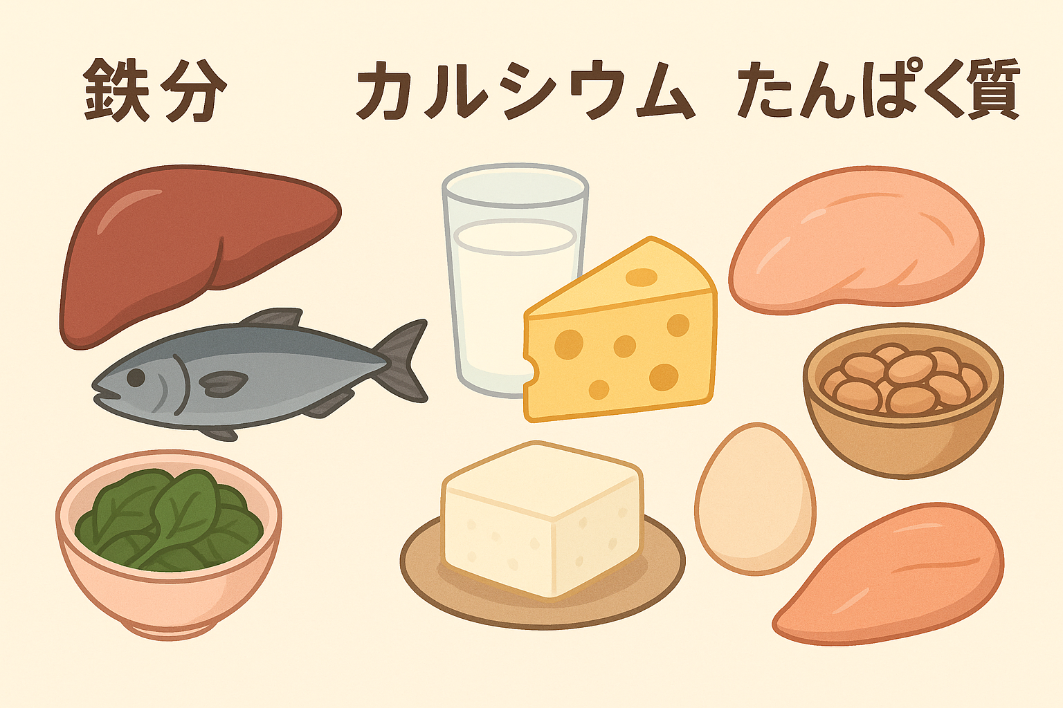 まず大切なのは、たんぱく質やカルシウム、鉄分、ビタミン、食物繊維をバランスよく摂ることです。たんぱく質は筋肉や肌、髪の健康を支えます。お肉や魚、卵、豆製品などを少しずつ毎食取り入れると、体のリズムが整いやすくなります。カルシウムや鉄分は骨や血液に関わる栄養素で、乳製品、小魚、緑黄色野菜、海藻類などを意識するとよいでしょう。